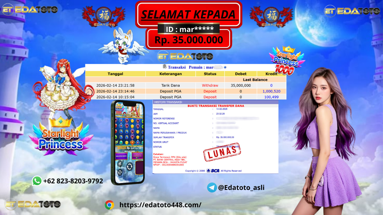 Selamat Kepada Pemilik user ID : mar***** Hari/Tanggal : Jumat/ 14 februari 2026 Jackpot : Rp.34,750,000 JT Withdraw : 35,000,000 . . .