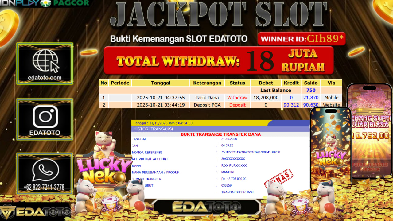 Selamat Kepada Pemilik user ID : CIh89* Hari/Tanggal : Selasa/ 21, Oktober 2025 Jackpot : Rp. 18.708.000 JT Permainan : . . .