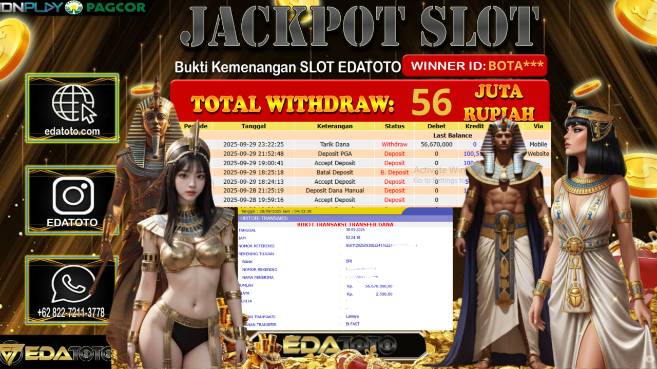 Selamat Kepada Pemilik user ID : BOTA*** Hari/Tanggal : Selasa/ 30, September 2025 Jackpot : Rp. 56.670.000 JT Permainan : . . .
