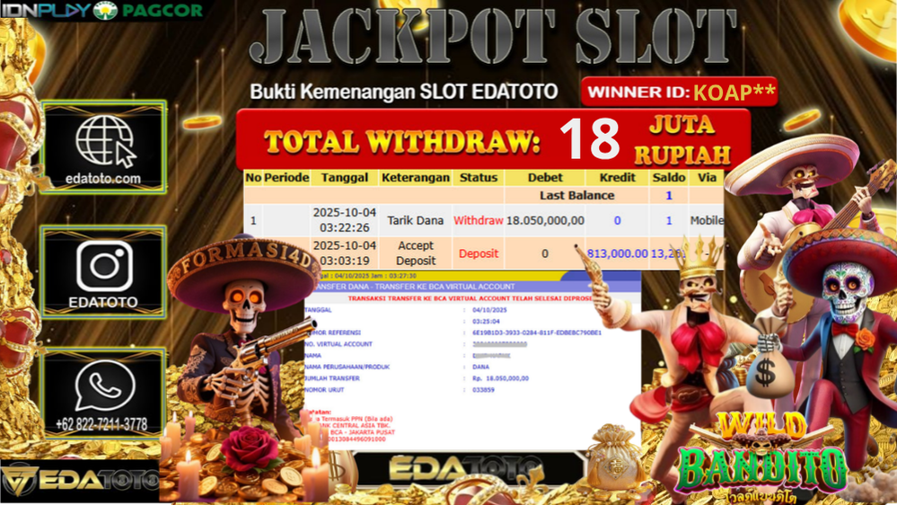 Selamat Kepada Pemilik user ID : koap** Hari/Tanggal : Sabtu/ 04, Oktober 2025 Jackpot : Rp. 18.050.000 JT Permainan :Wild Bandito . . .
