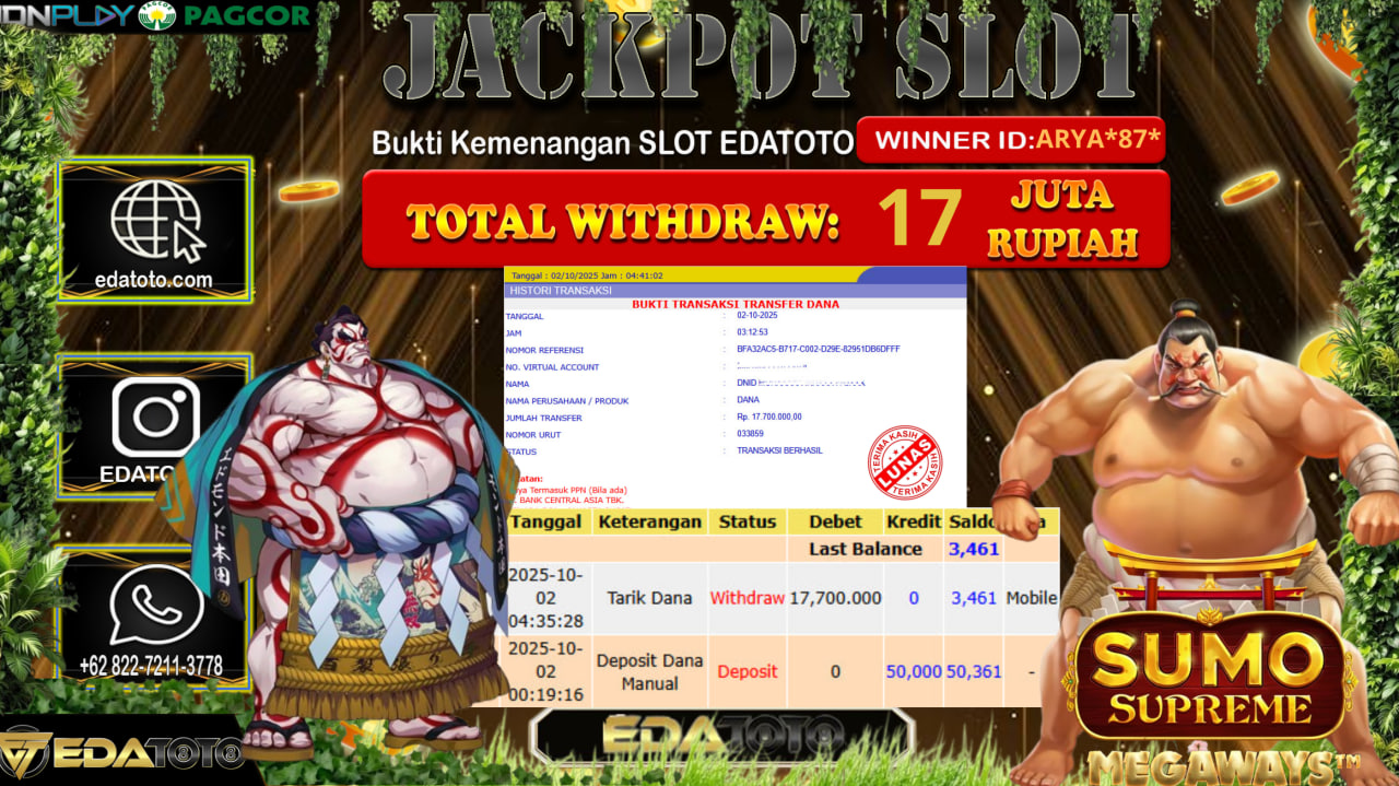Selamat Kepada Pemilik user ID : ARYA*87* Hari/Tanggal : Kamis/ 02, Oktober 2025 Jackpot : Rp. 17.000.000 JT Permainan : Sumo . . .
