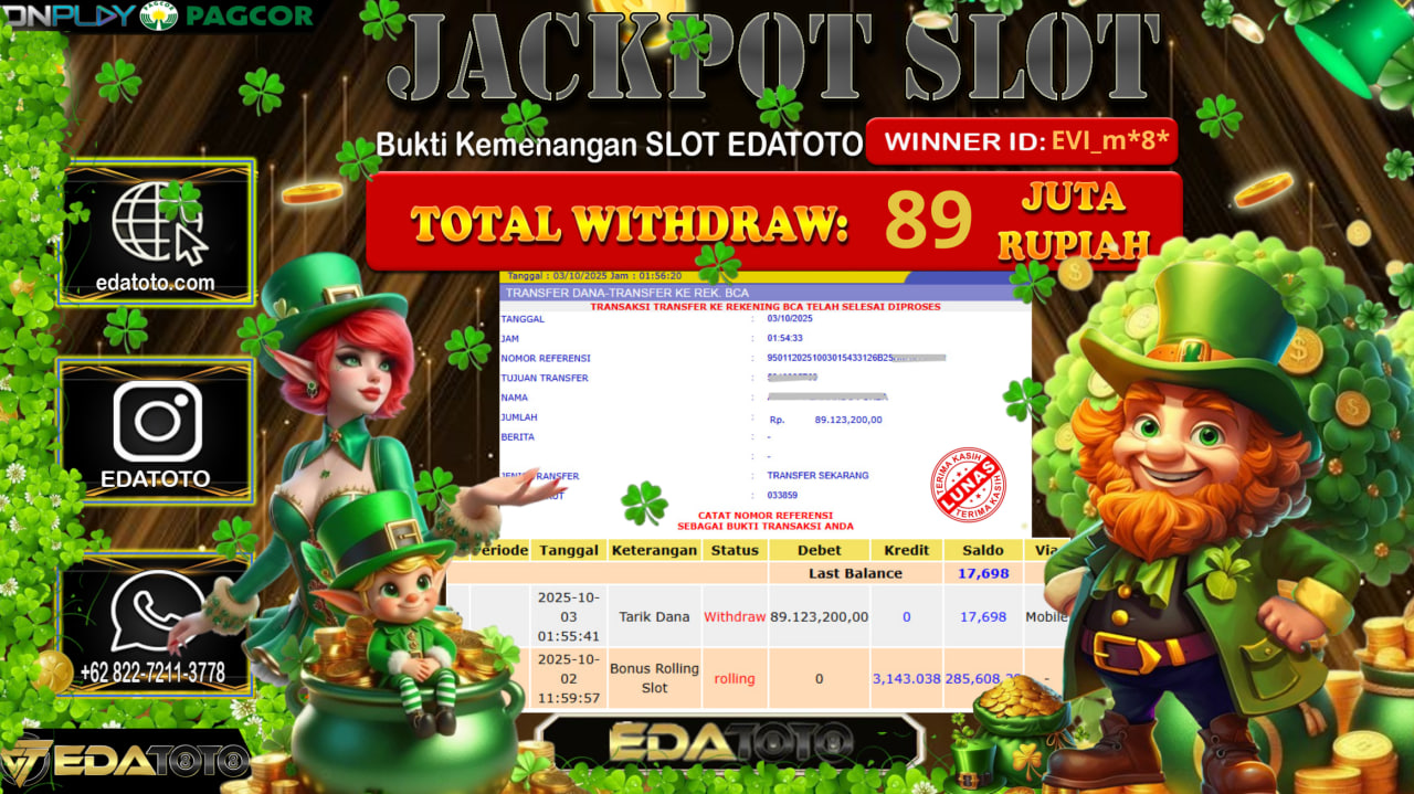 Selamat Kepada Pemilik user ID : EVI_m*8* Hari/Tanggal : Kamis/ 03, Oktober 2025 Jackpot : Rp. 89.123.200 JT Permainan : Gold . . .
